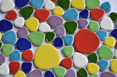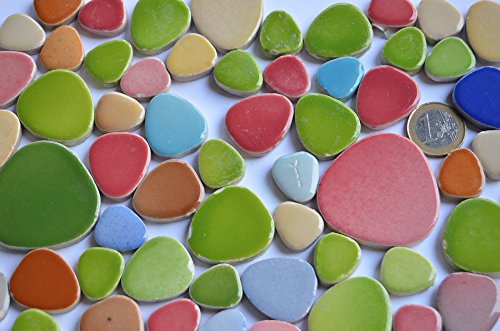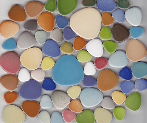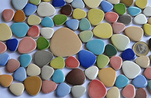 60 Stück lose (ca. 300 Gramm) keramische Mosaikfliesen "Pebbles Mosaik Buntmix", je nach Größe der einzelnen Stücke sind 60 Stück Mosaiksteine enthalten. Die unregelmäßig geformten Fliesen (siehe Bild) sind in ca. 4 verschiedenen Größen (von ca. 2 cm bis ca. 4,5 cm Durchmesser, Stärke: ca. 0,50 cm) im Beutel zufällig gemischt. Sie erinnern in ihrer besonderen Form an durchgeschnittene Kieselsteine.
