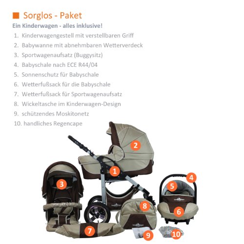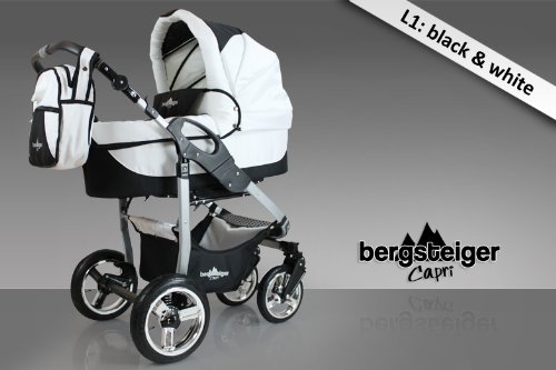 Riesiges Kinderwagenset aus dem Hause Bergsteiger. Dieses Paket lässt keine Wünsche offen und wird Sie und Ihr Kind vom Säuglingsalter an begleiten. Enthalten sind sowohl eine Babyschale (für das Auto), eine Babywanne und ein Sportsitz (Buggy). Die einzelnen Aufsätze lassen sich in sekundenschnelle wechseln. Die ausgeklügelte Konstruktion ist leicht zu bedienen. Durch das geringe Gewicht und Größe können Sie diesen Kinderwagen sehr einfach im Auto verstauen. Sicherheit hat Vorrang! Mit diesem Kombikinderwagen sind Sie immer auf der sicheren Seite. Der Bergsteiger Kinderwagen erfüllt die europäische Sicherheitsnorm EN1888. Diese legt sicherheitstechnische Anforderungen in Bezug auf Materialien, Aufbau und Standsicherheit fest. Die Babyschale entspricht zudem der Zulassungsnorm ECE 14/04 und erfüllt somit allen Qualitäts- und Sicherheitsstandards für Kinder-Rückhaltesysteme. Tolle Farben - moderne Konstruktion. Dieser Bergsteiger Kinderwagen ist nicht nur äußert flexibel einsetzbar, sondern ist auch ein absoluter Blickfänger. Die moderne Farbgestaltung in Verbindung mit den großen Luftreifen auf den Chromfelgen sorgt für eine wunderschöne Optik. Geniales Preis- / Leistungsverhältnis. Die Kinderwagen von Bergsteiger bieten außergewöhnliche Ausstattung und Qualität bei einem fairen Preis . Nicht ohne Grund erfreuen sich diese Kinderwagen immer größerer Beliebtheit. Die Resonanz anderer Kunden ist äußerst positiv. Top Service - keinerlei Risiko. Sollte dann doch etwas nicht nach Ihren Vorstellungen sein, steht ein kompetentes Team Ihnen auch nach dem Kauf immer zur Verfügung. Die Beschaffung von Verschleißteilen wie Schläuche oder Reifen ist kein Problem. Dieser Kinderwagen wird Sie zufriedenstellen - garantiert!