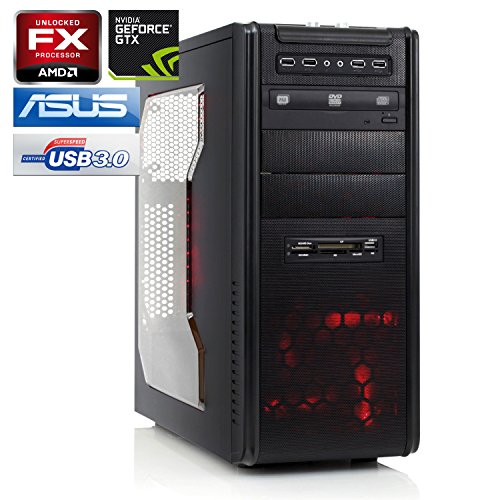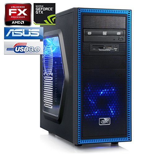 For this price, the CSL PC Sprint D10013 - AMD FX-6300 6x 3500MHz, 8GB RAM, 1000GB HDD, GeForce GTX750 Ti, DVD, CardReader, GigLAN, 7.1 Sound, USB 3.0 comes widely recommended and is a popular choice for many people. CSL-Computer have added some great touches and this means good value.