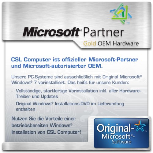 Dieser PC wird Ihnen mit vorinstalliertem Microsoft® Windows® 7 Professional 64Bit geliefert. Diesem PC liegt eine gratis CSL Software-CD bei, auf der Sie eine Auswahl nützlicher Programme finden.