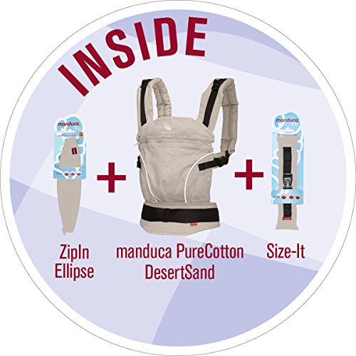manduca Babytrage PureCotton > Premium Bundle DesertSand < Optimierte 3P-Sicherheitsschnalle - Von Geburt an Paket incl. SizeIt (Stegverkleinerer) & ZipIn Ellipse (für Neugeborene), beige from Wickelkinder GmbH, Marburg