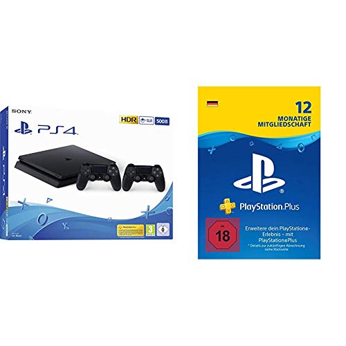 Dieses Bundle enthält: PlayStation 4 - Konsole (500GB, schwarz, slim, F-Chassis) inkl. 2 DualShock 4 Controller und PlayStation Plus Mitgliedschaft | 12 Monate | deutsches Konto | PS4 Download Code