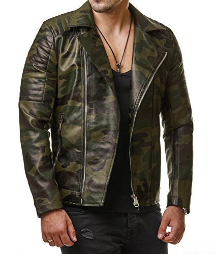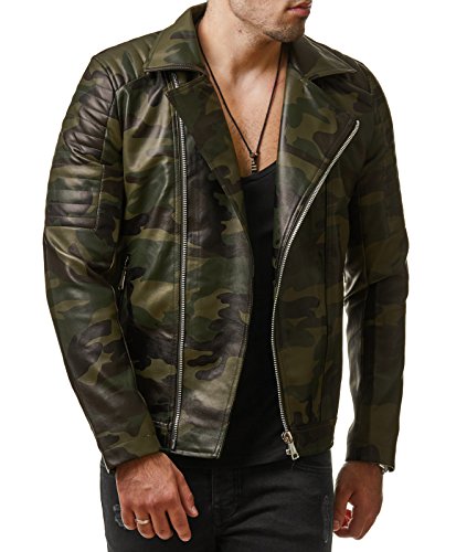 Prestige Homme MR18-4 Herren Kunst Lederjacke Biker Jacke Gesteppt Schwarz Rot S-XXL, Größe:L;Farbe:Camouflage
